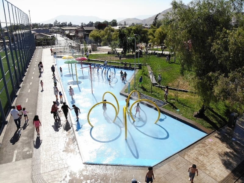 Ahí hay unas estructuras con forma de argollas y paraguas desde donde caen chorros de distintas potencias, que sirven para capear el calor durante esta temporada.