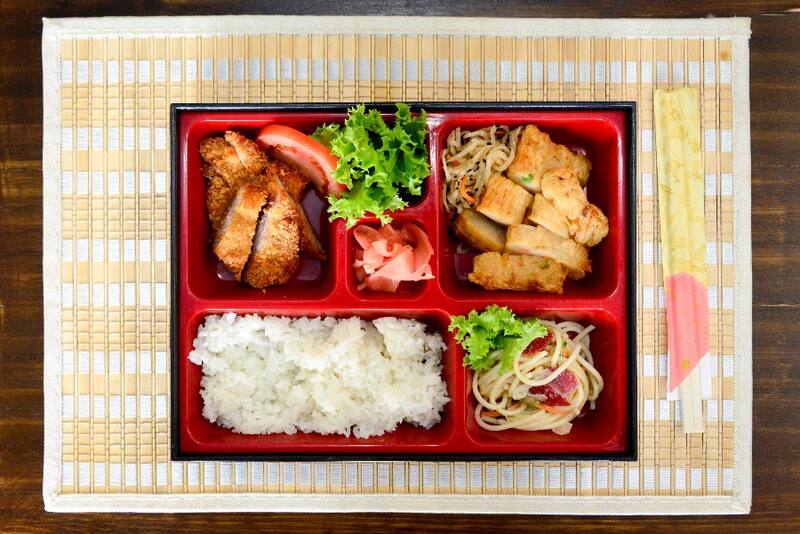 Y que en el caso de Donkame Yoko, puede incluír menchikatsu que son unas croquetas apanadas de carne de cerdo; marine,que es una merluza acevichada y agridulce; sarada, ensalada de fideos con pepino y jurel, más arroz blanco.