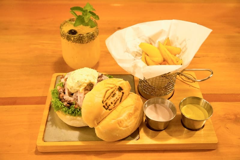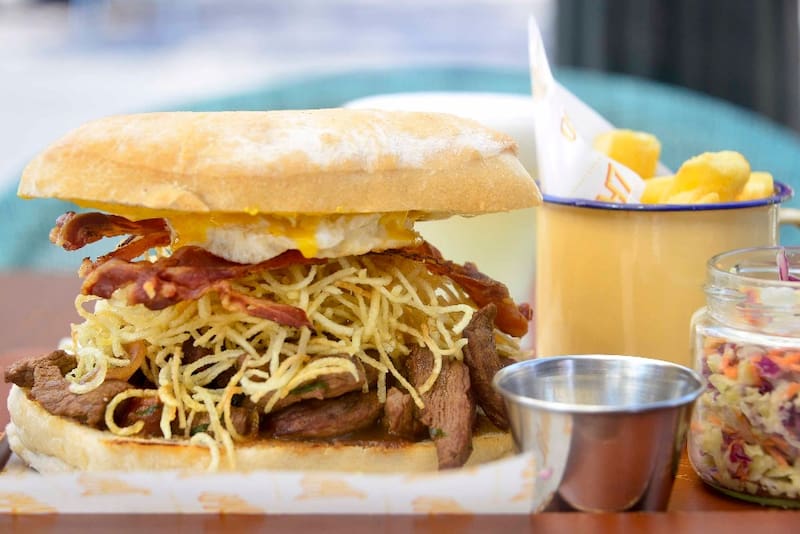 Tiene varios hits, como el sánguche de "chicharrón" (7.990), que lleva una suave carne de chanchito acompañada por camotes fritos perfectamente crocantes —hechos al estilo de las papas hilo—, lechuga, mayonesa y zarza criolla.