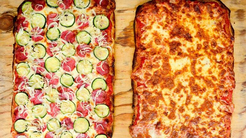 Se trata de una masa más gruesa, esponjosa y a la vez con un dejo de crocancia, que puedes pedir para llevar, o probar por trozos en el local.