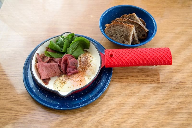 O alguno de los sartenes, como el de "huevo pochado" ($ 5.000), con huevos, pastrami o berenjenas asadas, rúcula, palta, polvo de hongos y una panera con estas tostadas de ensueño.