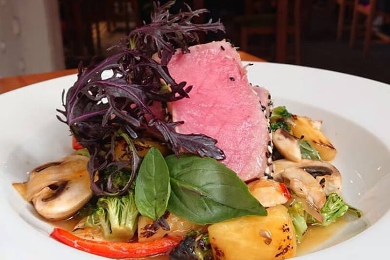 Uno de ellos es el "plan thuna Leyxy" ($ 12.900, en la foto), que es un atún fresco sellado a la plancha, cubierto de sésamo y servido sobre verduras salteadas con piña en salsa de mango, más salsa de ají.