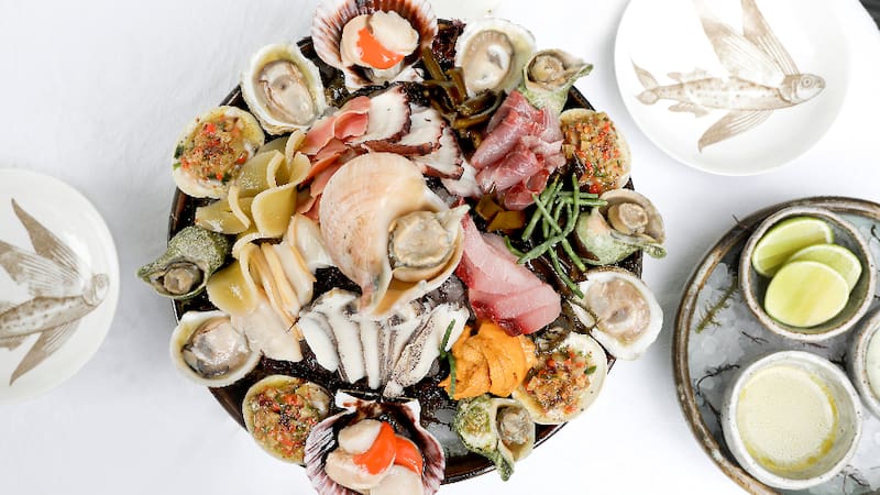Es decir, machas y locos apenas blanqueados, ostras, almejas, pulpo, erizos y cortes de pescado al estilo sashimi, crudos, como atún de aleta larga, lisa y corvina. Más tres tipos de caracoles, como el trumulco y rubio locate, más cochayuyo, ulte y salicornia conocida como “espárrago de mar”. Puedes ver el artículo completo aquí.