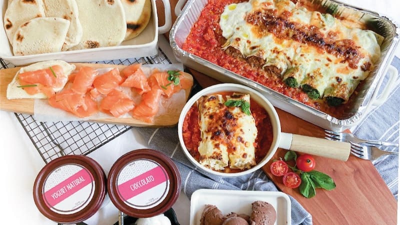 O el " Box 6" ($40.000 para seis personas), con paté tradicional, grissini, una lasaña boloñesa mediana, otra lasaña de alcachofa mediana y un postre de tres leches.