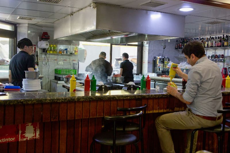 Es un bar de barra larga, con una plancha a la vista que se encarga de todos los sánguches que salen contundentes para los comensales, con mesas de melamina empotradas, servilleteros gigantes y dispensadores de mostaza, ají y kétchup.