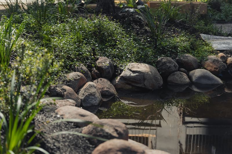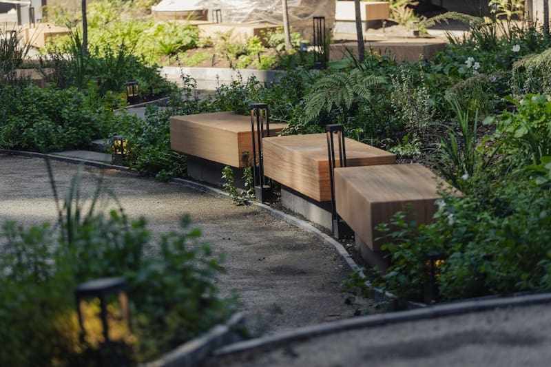 Además, posee un pequeño riachuelo por donde el agua fluye y hasta donde nadan pequeños peces de colores, y zonas de descanso con mesas y asientos, algunos de ellos con vista despejada hacia la calles y los edificios vecinos.