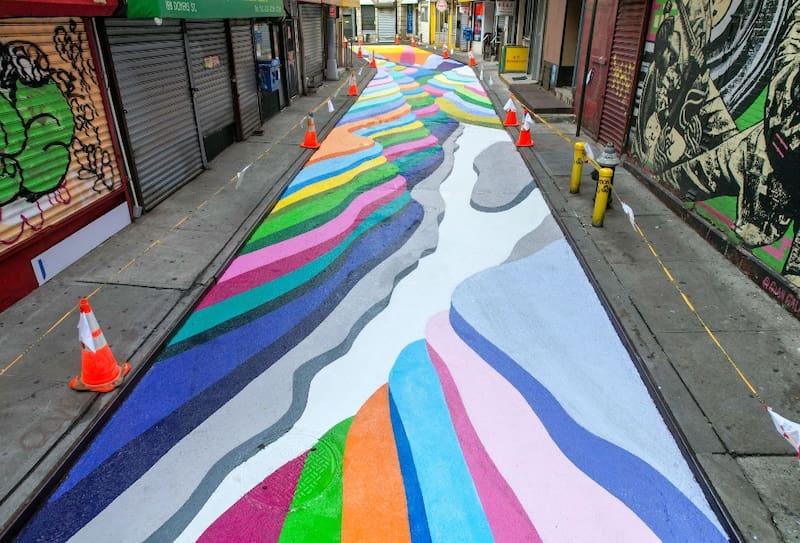 Se trata de Rice terraces, una pintura de piso que acaba de inaugurar en el paseo peatonal de Doyer St., en pleno barrio de Chinatown, y que intervino por encargo del Departamento de Tránsito de Nueva York y del Business Improvement District of Chinatown.