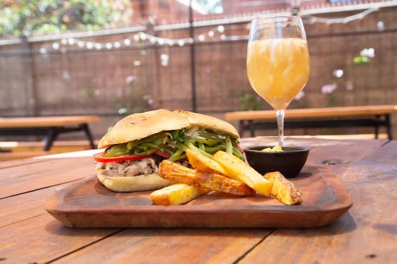 La misma que pruebas en alternativas como el sánguche de pernil ($ 6.900), hecho de la carne de las manitos de cerdo desmenuzada, que puedes pedir en chacarero o italiano. Llega en marraqueta, con ají encurtido y papas fritas.