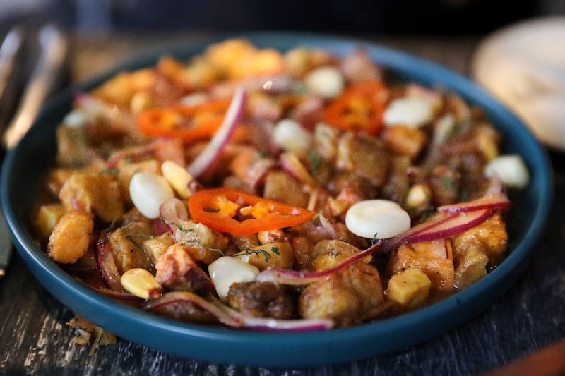 Otra alternativa es que pruebes el Fish & chips ($ 8.900), de congrio negro, papas souflé y mayonesa de algas cítricas; o el ceviche de plátano ($ 7.100), un plato vegano, de plátano verdes asados, cochayuyo, camote crocante, cebolla morada, leche de tigre veggie, maíz peruano, cilantro y pasta de ají amarillo.