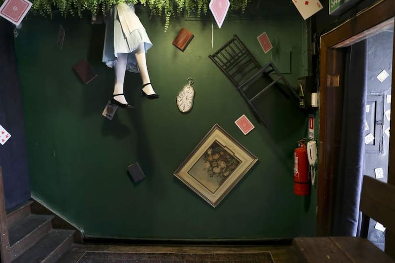 Frases icónicas de la película, sillas colgando en el techo, murales del Conejo Blanco, decenas de relojes y luces de neón son sólo algunos de los elementos de este lugar inspirado en Alicia en el País de las Maravillas.