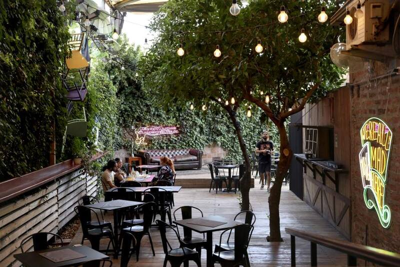 Lo mejor llega al final, cuando veas el patio lleno de árboles y luces de neón, donde te puedes sentar a disfrutar de las tardes de primavera y verano.