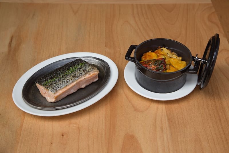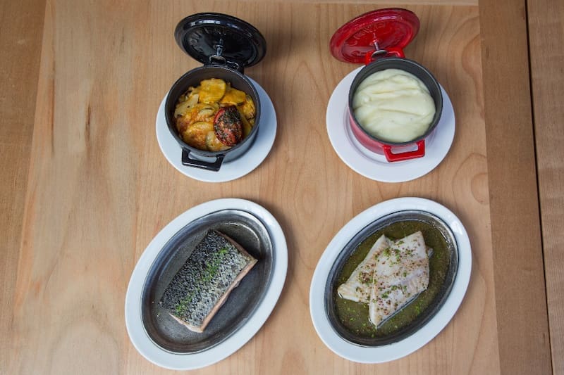 También puedes pedirlo con salmón sellado, con un filet rôti a la finas hierbas, por ejemplo, o boueuf bourguignon, el estofado de carne clásico francés.