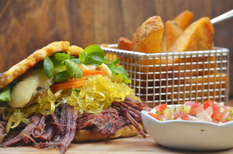 La preparación lleva cabrito desmechado cocinado en vino tinto. A eso le agregan cebolla y zanahorias sazonadas en comino, queso de cabra grillado, mermelada de ajíes verdes, berros frescos y mayonesa casera.