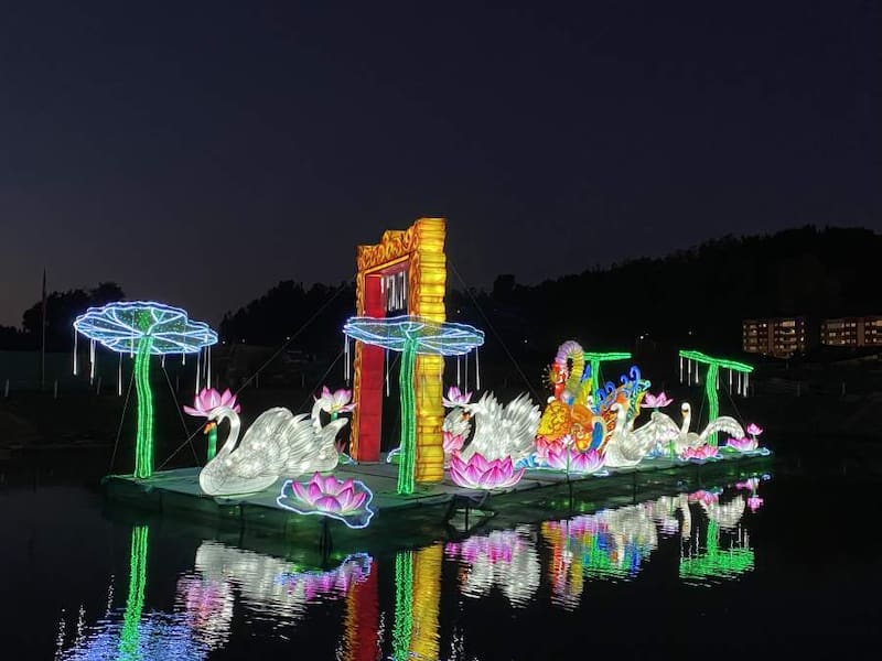 En el parque también hay dos lagunas artificiales especialmente creadas para esta ocasión, donde flota una gran placa con hermosas estructuras iluminadas de cisnes y peces enormes.