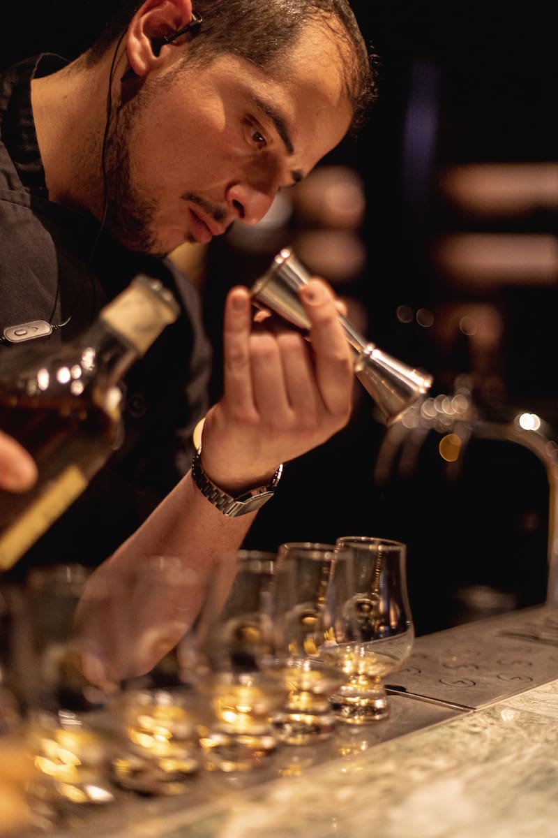 La amplia carta de whiskies reúne destilados provenientes de distintas partes de Escocia, Irlanda, Japón y Estados Unidos: desde clásicos como Jack Daniel’s Original No.7 hasta etiquetas menos usuales como Suntory Hibiki y Macallan 18 Sherry Oak.