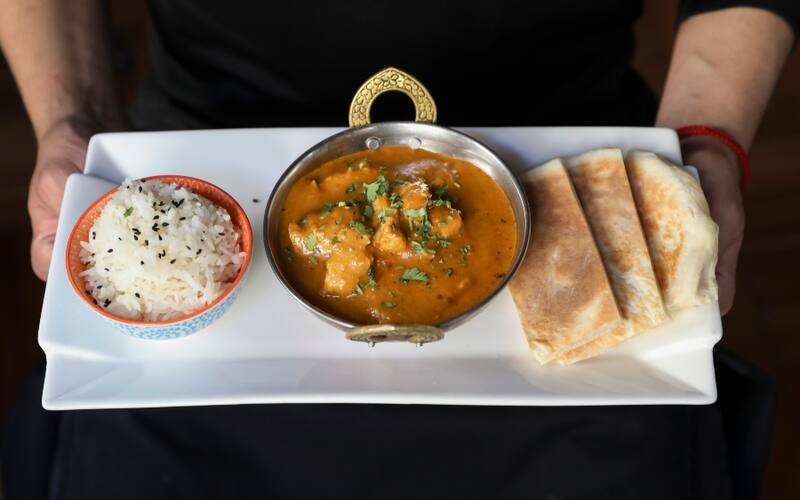 Además de varias preparaciones de la cocina de la India, como el Tikka masala ($ 11.850), guiso de pollo en base a salsa de tomate, leche de coco y garam massala, que se sirve con arroz blanco y pan naan, el Dall ($ 11.850), lentejas rojas cocidas con vegetales, champiñones, camote, leche de coco y garam masala acompañado de arroz.
