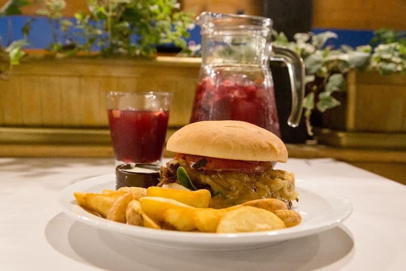 Acompáñala con alguna de las hamburguesas, como la "virgen" ($ 7.900), con queso cheddar, tocino, aros de cebolla, pepinillos y salsa bbq.