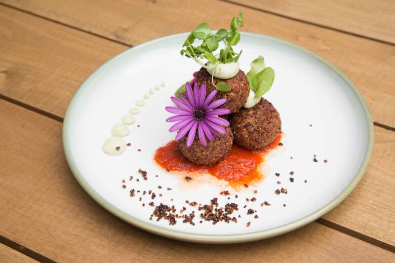 En Flora todo lo que hacen está inspirado en la naturaleza, como los “Conos de salmón”, que son cuatro barquillos artesanales rellenos de tartar de este pescado, mango, tomates cherry, palta, cebolla morada, quínoa y lactonesa. Lo entretenido es que llegará a la mesa en un macetero, simulando ser una planta, y la tierra de ésta será de porotos negros ($ 8.900).