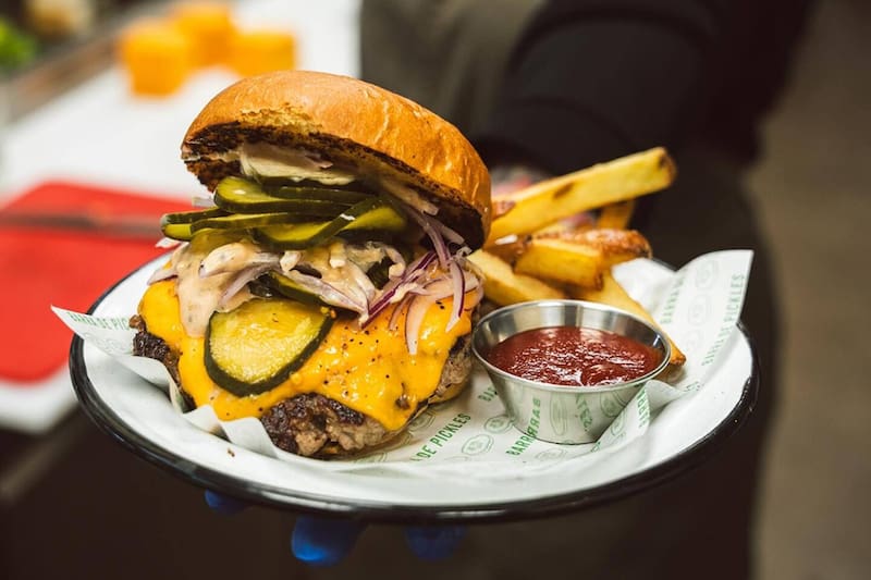 También la Cheesburger con papas fritas ($ 10.500), en pan de papa, con queso americano, pepinillos, cebolla morada y salsa de la casa. Ojo, que no se te olvides pedir el punto de cocción de tu hamburguesa.
