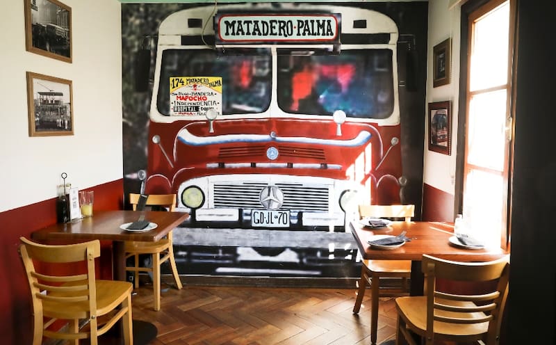 Así, por ejemplo, en una de las paredes puedes ver un gran mural de legendario recorrido de micro Matadero-Palma y en otra fotografías de locales y picadas emblemáticas de Franklin, algunas ya desaparecidas, como el Melville o Los Tres Mosqueteros.