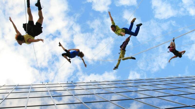 Con una asombrosa combinación de música y danza aérea entre los edificios llega esta obra gratuita, que es parte del festival Teatro a Mil.