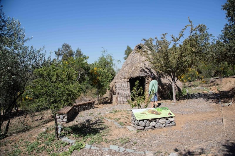 Las casas se reparten por las laderas del cerro y entre ellas verás la Hare Paenga, típica de Rapa Nui, que tiene forma de bote invertido; otra representativa del pueblo Ona o Selk’man, de forma triangular y hecha con con madera de Nothofagus, y una Ruka Lafkenche, del pueblo mapuche costero.