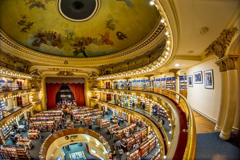 La famosa librería El Ateneo Grand Splendid. Es una preciosidad para los amantes de las librerías y los turistas en general, los precios de los libros varían, pero pueden encontrarse importantes títulos por 8 dólares promedio es decir casi 6 mil pesos chilenos algo muy barato para nosotros los chilenos quienes pagamos caro por ellos.