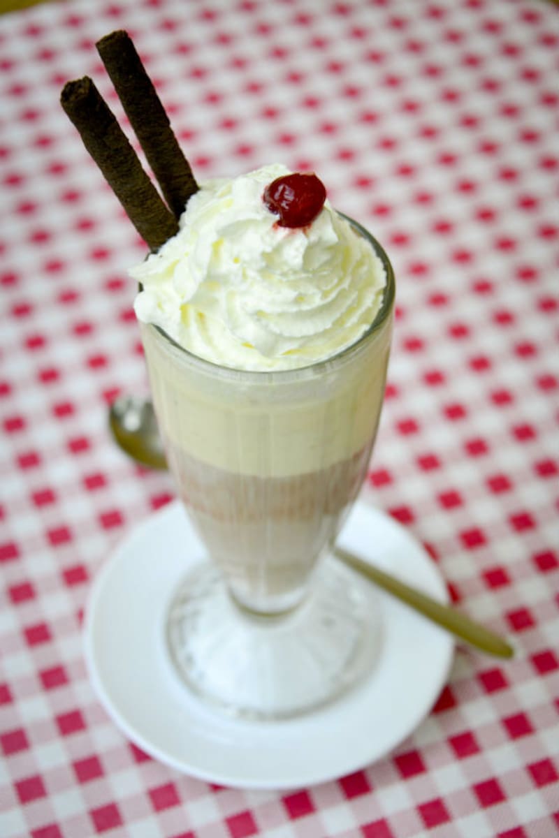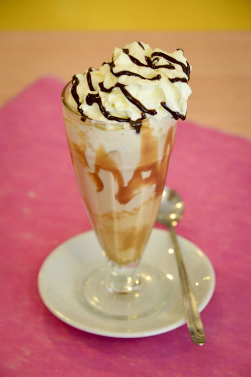 Se puede pedir sin crema chantilly, o con la porción que uno prefiera. Arriba, dos bastoncitos de galleta de chocolate coronan la copa, una que se va rapidito sorbiendo con la bombilla o cuchareando.