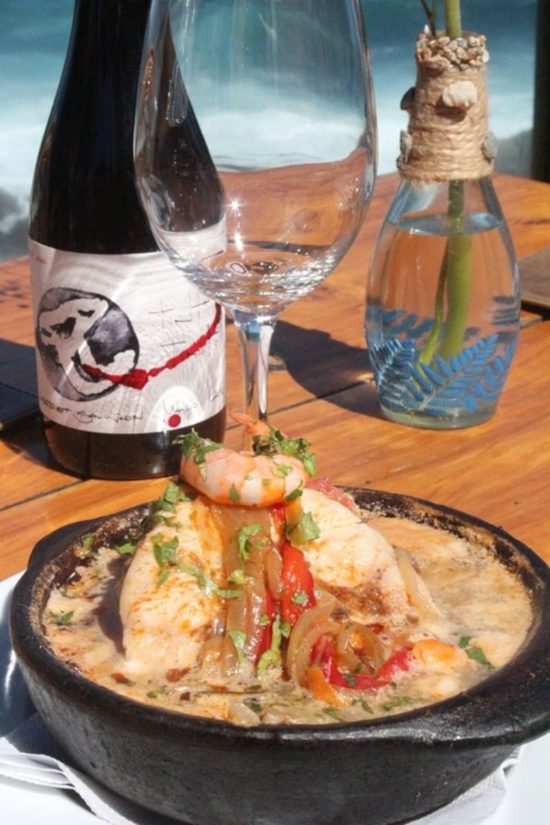 Acá lo sirven en una fuente grande de greda, contundente, con un buen trozo de congrio negro que traen de la caleta de El Quisco.