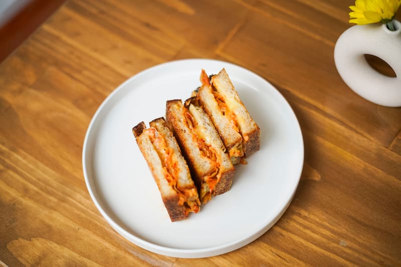 Otra opción es el el Prensadito de queso kimchi ($ 6.500), una joyita en pan hogaza, con un kimchi suavecito hecho ahí mismo; o la Hamburguesa ($ 9.500), de un blend de carne a la parrilla, con queso mantecoso, ají encurtido, cebolla fresca y salsa de la casa en pan brioche.