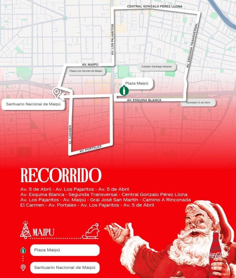 Puedes ver a continuación el mapa con el recorrido de la Caravana Coca Cola 2024 en Maipú.