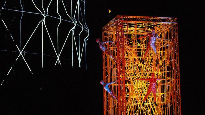 Un montaje de teatro urbano que utiliza grandes máquinas en movimiento en tres escenarios diferentes y enormes plataformas voladoras maniobradas por una grúa telescópica a 80 metros del suelo.
