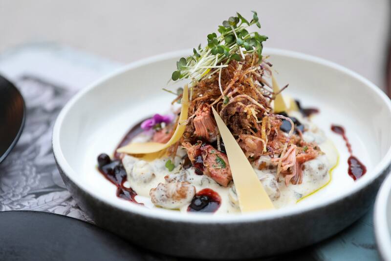 O con el Confit de invierno ($ 13.900), con jackfruit, conocida como la fruta de árbol más grande del mundo, y por tener una textura similar a la carne, que va sobre ñoquis de papa morada, con salsa de quesos, salvia, salsa de vino tinto y arándanos.
