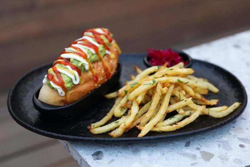 También el Poema 20 ($ 9.900), un hot dog veggie con tomate, palta, mayonesa, mostaza y ketchup, acompañado de papas trufadas y chucrut casero.