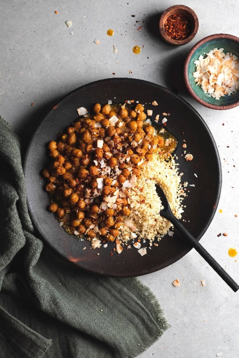También puedes armar un menú para dos o tres personas ($ 23.200), de almuerzo o cena, que incluye dos sopas como la de brócoli, papa y espinaca o la de coliflor con manzana verde, además de platos como guiso marroquí de garbanzos con especias y escamas de coco tostado, que llega congelado y sellado al vacío, más couscous para que lo termines de cocinar en casa.