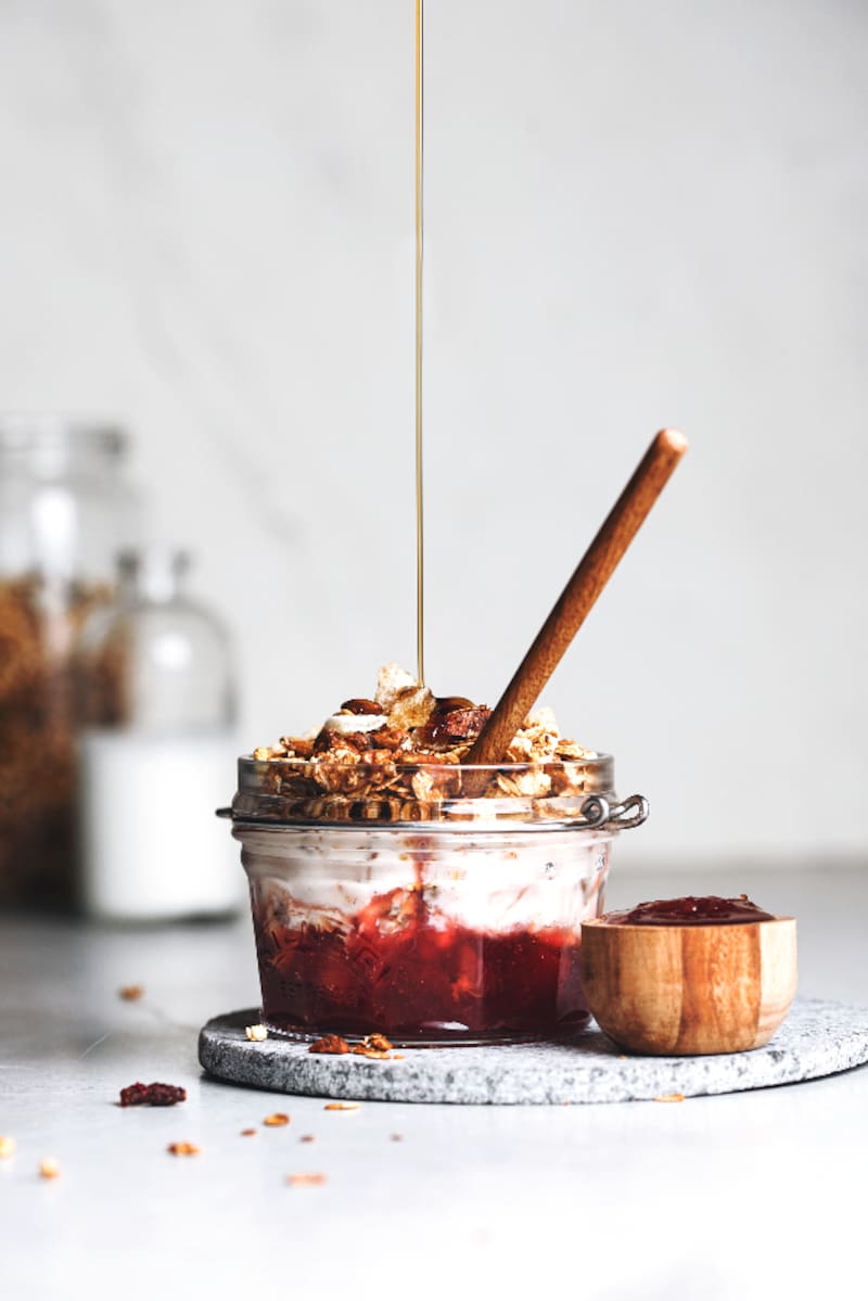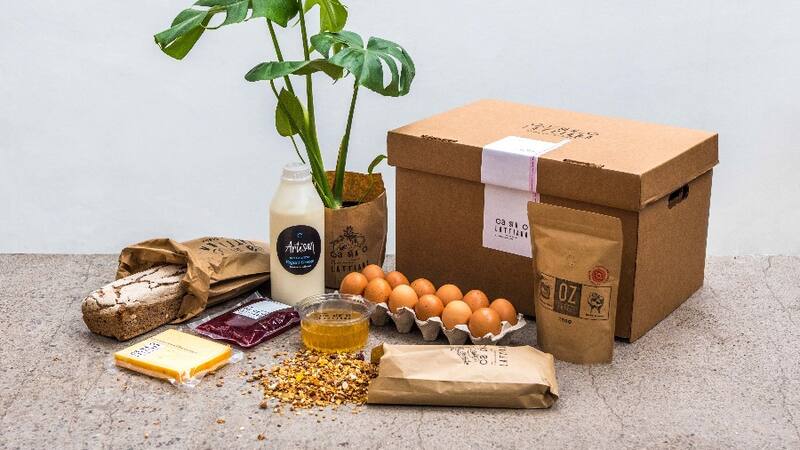 Es una caja que está pensada para una semana y trae café de grano molido, una docena de huevos de gallina feliz, granola hecha ahí mismo con un mix de frutos secos y avena crocante endulzada con miel, más un litro de yogur artesanal, queso mantecoso, mermelada de ciruela con naranja y anís.
