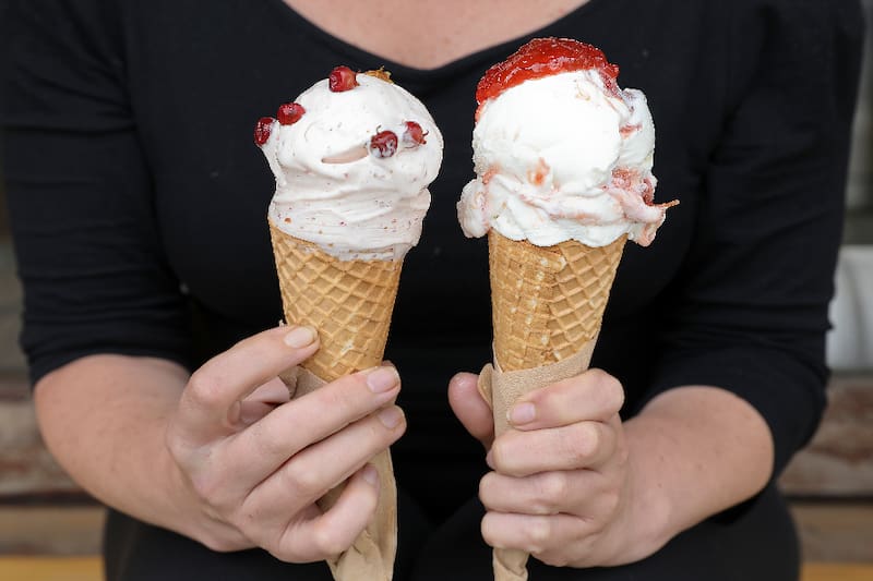 Sus helados cremosos son 100% naturales y los puedes probar en barquillo simple ($ 2.400) o doble ($ 3.400), de sabores como rutilla y grosellas, con un agradable toque ácido; o arándanos con miel de ulmo.
