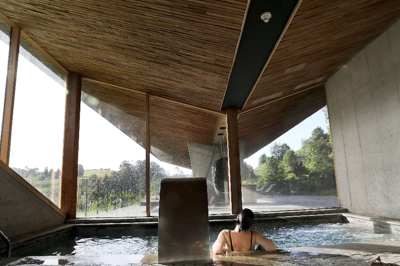 Además, tiene un completo espacio wellness o de bienestar, con sala de masajes, sauna y baños de vapor, junto piscina temperada al interior y otra al aire libre, con una vista espectacular a un sector interior del océano Pacífico.