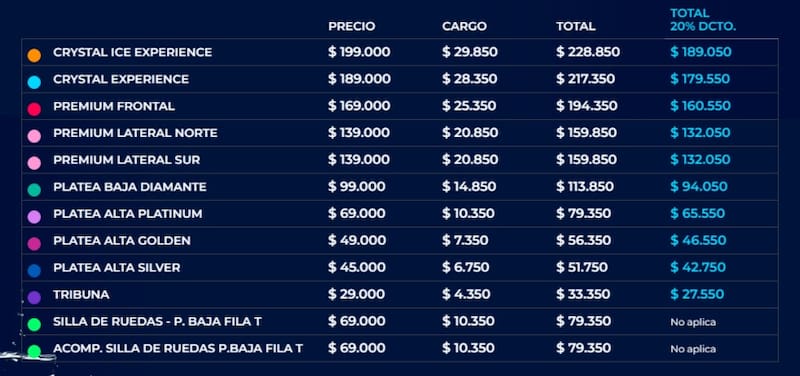 Los precios van desde los $ 33.350, que es el valor de la tribuna y llegan hasta los $ 228.850 que es lo que cuesta la Crystal Ice Experience.