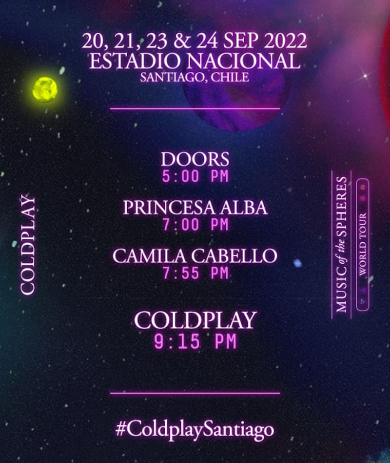 Su nueva es Santiago, con los nuevos conciertos de Coldplay en Chile, que de los días 20, 21, 23 y 24 de septiembre en el Estadio Nacional.