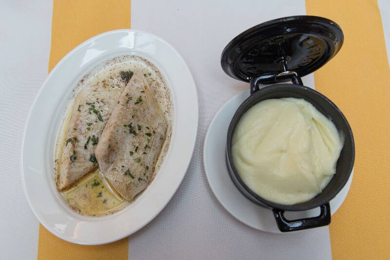 El aligot lo puedes acompañar de un filet rôti a la finas hierbas, o de una reinetameuniére, a la mantequilla, que llega en su punto exacto, jugosa nada de pescado recocido.