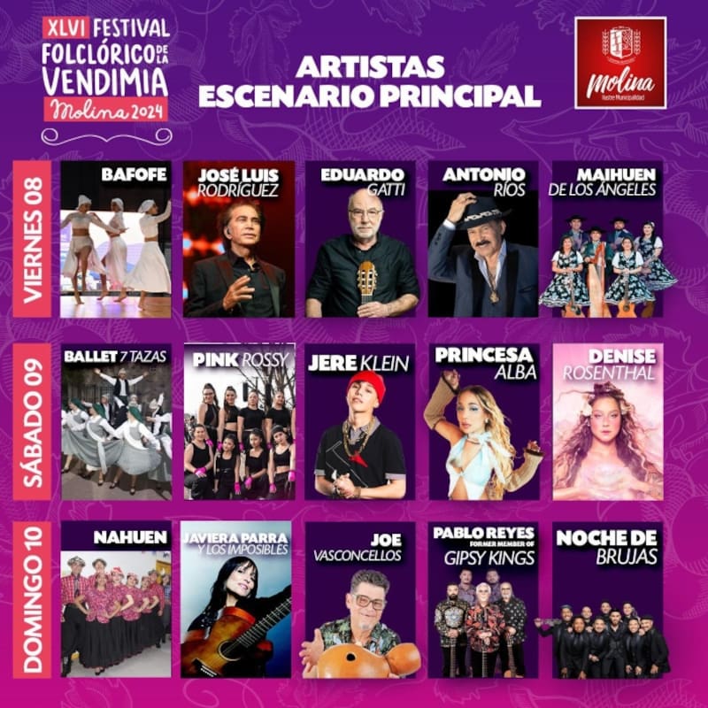 Puedes puedes ver al final de esta nota la programación con los artistas por día del Festival Folclórico de la Vendimia de Molina 2024.