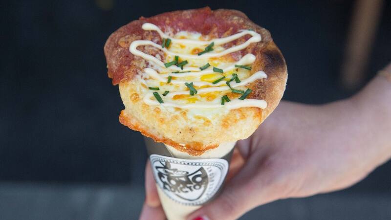Se trata de un cono que tiene la forma similar al de uno de helado, pero que está hecho de masa de pizza, esponjosa y crocante.