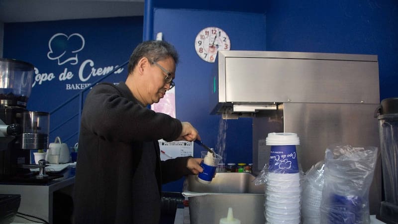 Tiene esas características porque se elabora con una máquina especial, traída de Corea, en la que se introduce la leche y esta sale convertida en forma de una espuma de nieve.