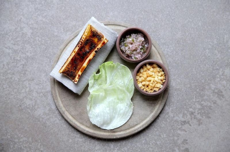 Se llaman "tacos de médula y ostras" y lo que hace las veces de taco son lechugas cortadas redondas y perfecta que se rellenam con la médula asada a la parrilla, las otras, y todo lo demás.