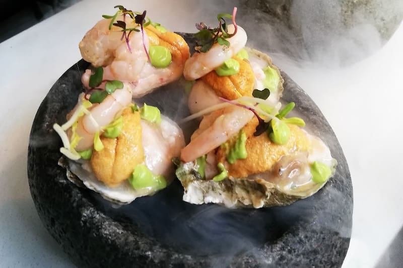 Su plato probablemente se llame "textura de mariscos" y es una delicia nitrogenada (se le echa nitrógeno para servirlo más frío): sobre la concha lleva una pequeña porción de ceviche, luego la ostra y encima una lengua de erizo y un camarón, todo, decorado con coulis de palta.