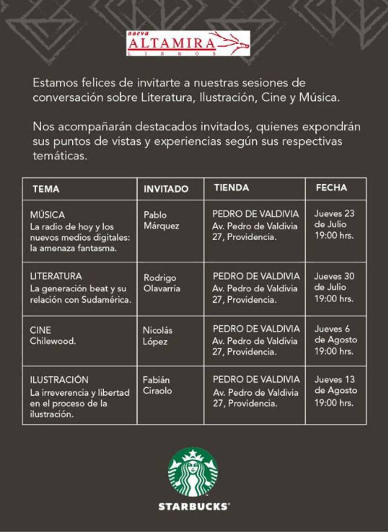 Serán cuatro charlas dictadas durante cuatro jueves seguidos en el local de Starbucks en Pedro de Valdivia, que abordarán temas de música, literatura, cine e ilustración, bajo la visión de expositores que han vivido directamente el impacto de sus áreas. "Son temas que son muy cercanos a nosotros. Nos interesa y tenemos muchos libros que tienen que ver con la música, la generación beat o el cine. Pero, para esto, quisimos llevar los tópicos a un espacio distinto, ameno, que permitiera a la gente socializar y discutirlos en un ambiente grato", dice Gaspar García, jefe de tienda de Nueva Altamira.