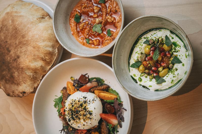 Por lo que puedes partir por el Labneh ($ 6.000), similar al queso, denso y cremoso, que se acompaña de tomate rallado, ajo y especias como zaatar, aceite de oliva y pan pita hecho en el lugar.
