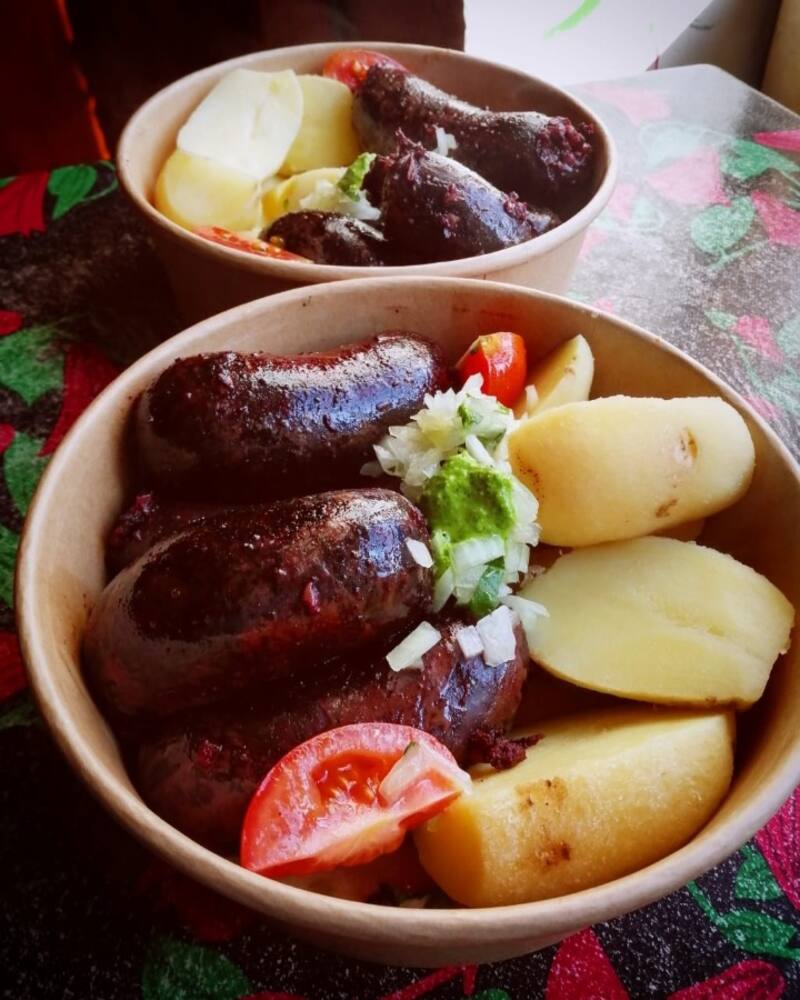 Otra alternativa son las prietas, que vienen con papas cocidas y la salsa, además del pastel de papa, hecho con un pino de prieta.