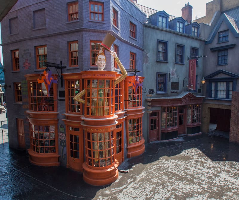 El famoso distrito comercial que figura en las películas incluye la tienda de varitas Ollivanders, que ofrece una experiencia teatral en la que los visitantes pueden ver cómo una varita elige a un mago o bruja, una persona del público que es invitada a interactuar frente a todos.